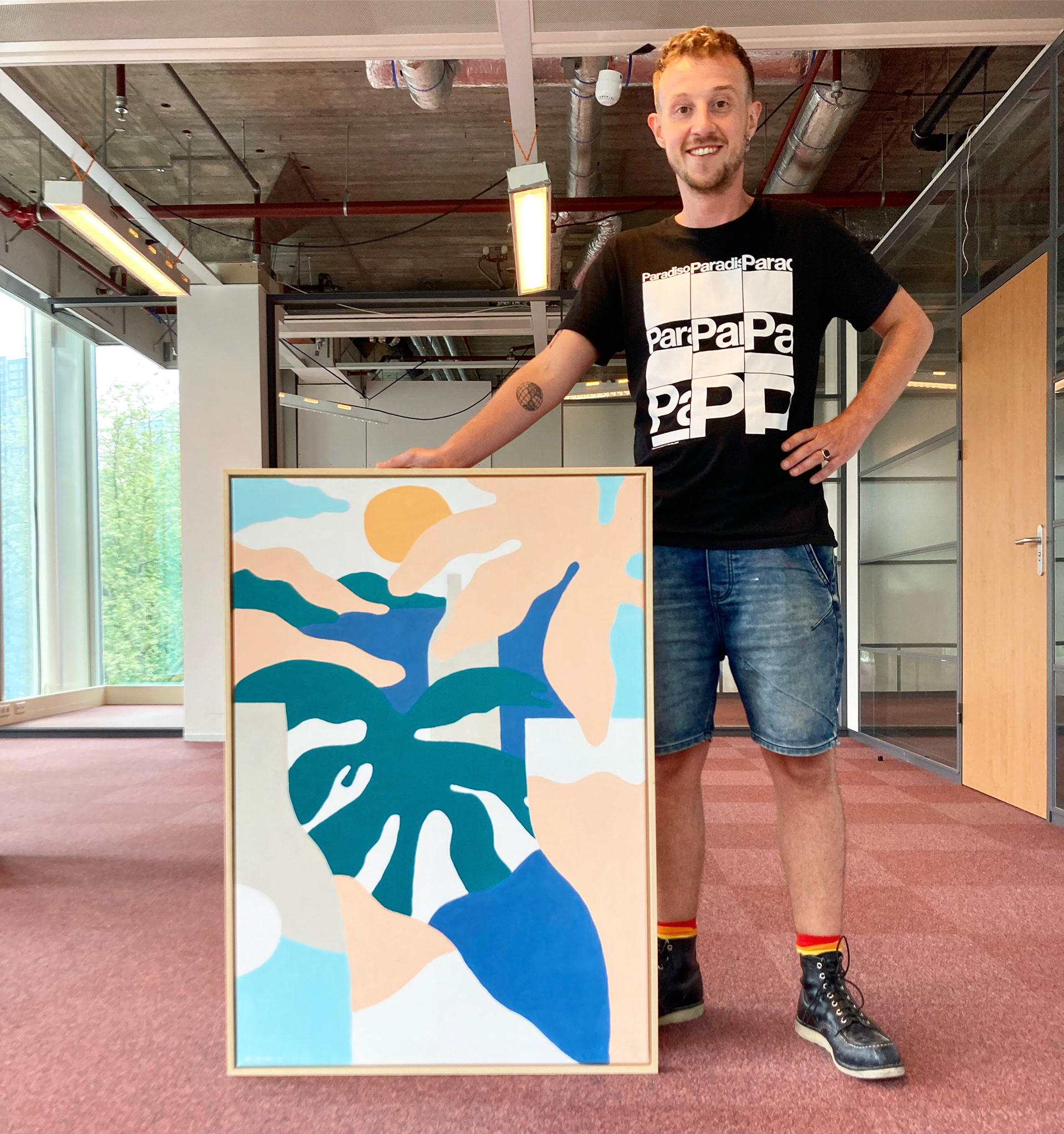 I made this canvas for a couple's house in Torrox Costa in Spain. This piece intents to visualize a perfect day in Spain. Elements such as the sea, the mountains and palm trees symbolize the surroundings of Torrox Costa and I combined it with a color palette that matches the interior of their holiday home. Life should be celebrated and that is the atmosphere I tried to create with this piece. The dimensions are 70x100 cm and it is painted with acrylics